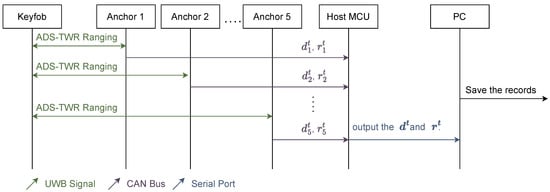 For evaluation, we built an on-vehicle localization system, in which the anchors were configured as shown in Figure 1 and the workflow is shown in Figure 4. In the system, the UWB ranging was based on Decawave DW1000 chipset with a data rate of 110 Kbps, channel 2, indicating a bandwidth of 3774.0–4243.2 Mhz, and a preamble code frequency of 64 MHz and length 2048. The collecting system was built on Renesas RH850, which is a single-core chip with no float point unit (FPU) and a main frequency of 80 MHz. No extra memory or storage chip was used except the integrated internal 512 KB flash and 32 KB RAM. The anchors and keyfob hardware are shown in Figure 5. The Anchors were connected by a wire for power and CAN communication, on which the ranging results and RSS were uploaded to the host MCU and then transmitted to a PC.