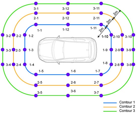 Data collecting points. The collecting points are labelled as purple dots. Contour 1 was 2 m from the car’s bounding rectangle, contour 2 was 4 m from the car’s bounding rectangle, and contour 3 was 6 m from the car’s bounding rectangle.