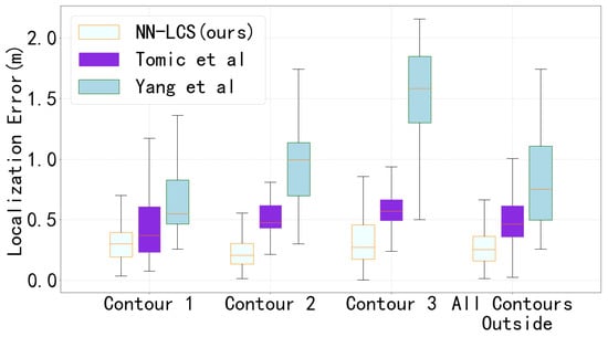 We use a boxplot to show the performance of the localization at the three contours, shown in Figure 7. We find that: (1) The Yang et al. method shows the biggest localization error on our dataset. This could be because of too much overfitting on the points in the training set. (2) Both of the two competing methods show significant rising trends as the distance between the keyfob and the vehicle increases. As shown in Figure 8, the original absolute NLOS error (TDMAE) at the three contours is similar. This means that the comparative methods become more sensitive to the NLOS error at further testing points. (3) The proposed NN-LCS method shows minimum localization error on all three contours. Furthermore, the localization error does not change significantly at the different contours.