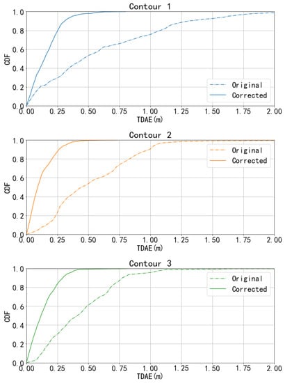 The cumulative distribution function (CDF) in Figure 8 shows the comparison between the original ranging results and the corrected results by our model in TDAE. In the original raw distance data, as the chain lines show, more than 40% of the error on each contour could exceed 0.5 m and more than 20% of the error on contour 1 could exceed 1 m which is a big threat to accurate decimetre localization. However, as the solid lines show in Figure 8, after the process of the DCNN in our model, the corrected distances show much less error in TDAE with at least 80% of the error on each contour less than 0.25 m. This proves the effectiveness of the DCNN and explains why the NN-LCS could work properly.