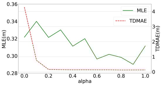 We carry out the experiment on distance loss weight described in the loss function Equation (16). As shown in Figure 9, with the increase in , the TDMAE decreases rapidly, and overall the MLE also decreases.