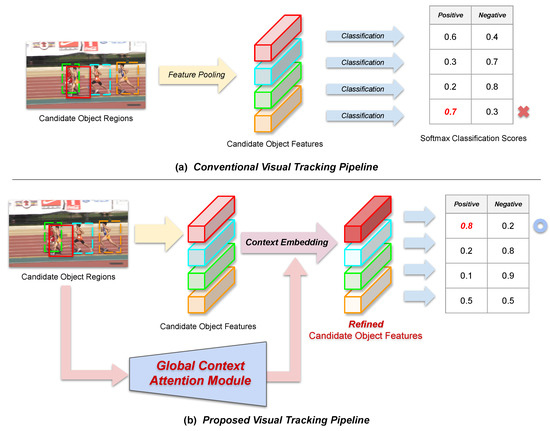 However, many existing tracking algorithms, including Siamese-network-based trackers, still focus on short-term tracking scenarios [12,13], where they make strong assumptions on the smoothness of the target’s motion. To impose these assumptions, tracking algorithms often assume a small search window around the target’s previous position and penalize large displacements using handcrafted cosine window functions with predesignated sizes and weights. While this strategy is effective for short-term tracking scenarios when the hyperparameters are properly tuned, this may cause the trackers to be susceptible to error accumulation and drift in long-term tracking scenarios [14,15], where the target can move abruptly due to camera motion, distractor objects of similar appearance are more likely to appear in a scene, and the target can show out-of-frame disappearances. To address the aforementioned issues, global search strategy-based tracking algorithms [16,17] were proposed with the benefits of re-detecting the target after long-term disappearances, scene changes, and recovery from occasional drifts caused by distractor objects. Although a global, full-frame search strategy for Siamese-network-based tracking algorithms [16,17] showed improved performance on various long-term tracking scenarios, the issue originating from distractor objects of similar appearance to the target object persists, where the tracking algorithms are often trained to find the single most similar-looking region inside a given frame image without consideration of the global context among numerous objects inside the scene.