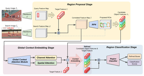 Region proposal stage: After obtaining the query and search feature maps using the backbone feature extractor network , a region proposal is performed to find multiple regions that resemble the target object, where these proposed regions serve as candidate regions for subsequent region classification. Using the query feature map and initial bounding box coordinates , spatially pooled target feature representation is obtained using the ROIAlign [41] operation, where s is the spatial dimension of the pooled feature representation. Afterwards, the depth-wise cross-correlation operation between the target feature representation z and the search feature map is performed as in,