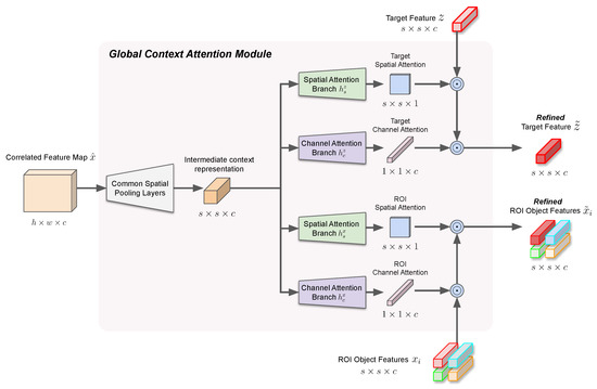 where subsequent region classification and bounding box refinement branches are equivalent to Equation (4). By applying two separate attention masks to ROI and the target feature representations, we can increase the adaptability of our proposed module to various scenes. An overview for the structure and operation of our proposed global context attention module is shown in Figure 3, and the overall step-by-step operation of our proposed tracking algorithm is shown in Algorithm 1.