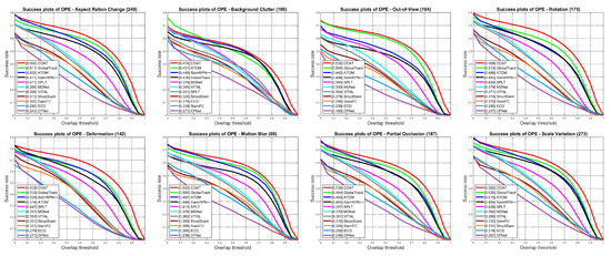 Success plots for eight challenge attributes of LaSOT test set. Best viewed on high-resolution display.