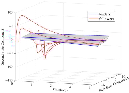 Followers converge into convex hull (the two state components represent the position coordinates of each vehicle).