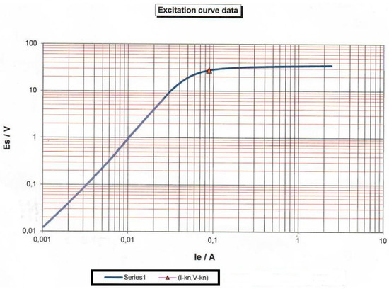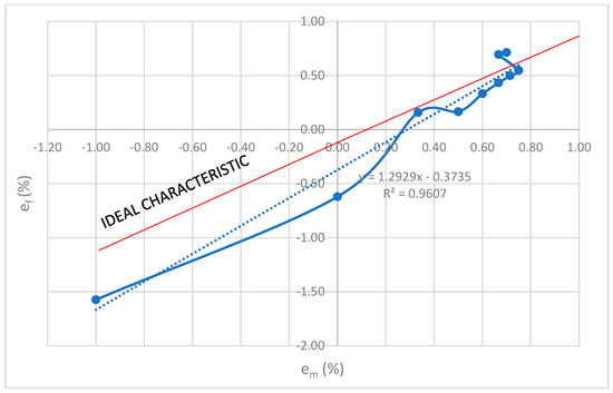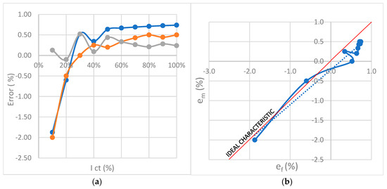 A specific curve in Figure 2 is obtained by connecting the points by “spline” type interpolation in the order in Table 1. The independent variable is the primary CT current, which increases linearly from 0 to 100% with a step of 10%. Two functions with dependent variables em and ef were used to graphically display the measure of deviation from the ideal characteristic, one on the ordinate axis and the other on the abscissa axis. This way of displaying results was applied in the rest of the work to all experiments.