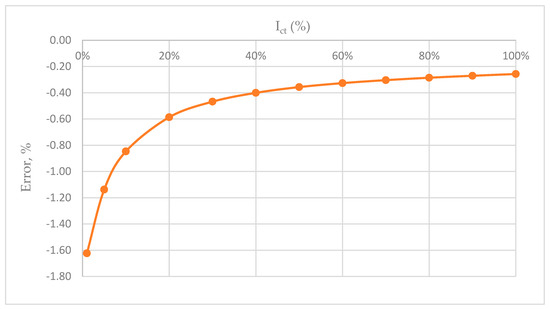 Based on the previous formula, the display of the CT error for the frequency of 50 Hz follows. The largest amount in Figure 8 is −1.6%. We notice that the error function is shifted towards the negative part of the scale.