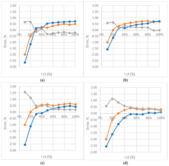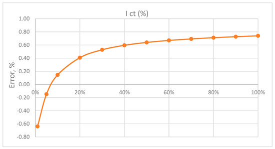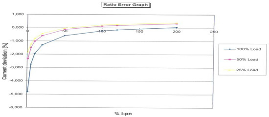 Figure 9 shows the CT diagram with the number of corrected windings. The number of windings was reduced from 100 to 99. This reduces the maximum measurement error for nominal values to 0.74%, and the interval within which the error is located is symmetrical around the abscissa of axis X. The comparation can be performed with a factory testing result of CT, which is displayed in Figure 10 for three specific loads.
