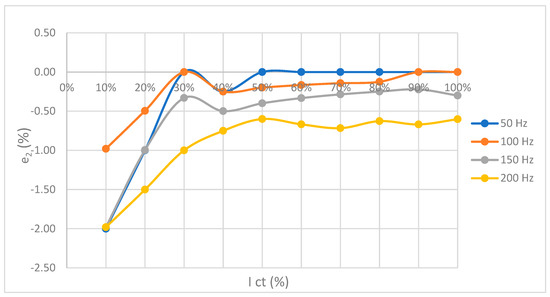 In the formula for CT error (28), the frequency is predicted to change in the variable w, so the frequency values are 50 Hz to 200 Hz. The current range ranges from 0.1 A to 1 A. The expression for the error is, in this case [5,6]: