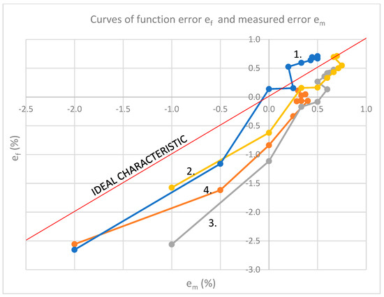 Figure 14 represents four curves of function error ef and measured error em. Differences between curves can be seen depending on frequency [8,9].