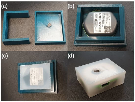 Dragon Skin™ 20, a high-performance platinum-cured liquid silicone compound, was used to seal the hole of the P6 sensor’s barometer to use it as a tactile sensor. The silicone will transduce the squeezing forces on the surface to changes in internal pressure that the barometer can detect. A custom 3D-printed mould (Figure 4a) was used to enclose the sensor and shape the silicone layer surrounding it. The silicone was cured overnight (Figure 4b,c) and unmoulded to create the final sensor core for the instrumented toys (Figure 4d). The manufacturer, Smooth-On, Inc., Macungie, PA, USA, provides a detailed material safety data sheet and skin-safe certification, making Dragon Skin™ 20 a suitable nontoxic silicone material for use in our application where infants might come in direct contact with the material [45,46].