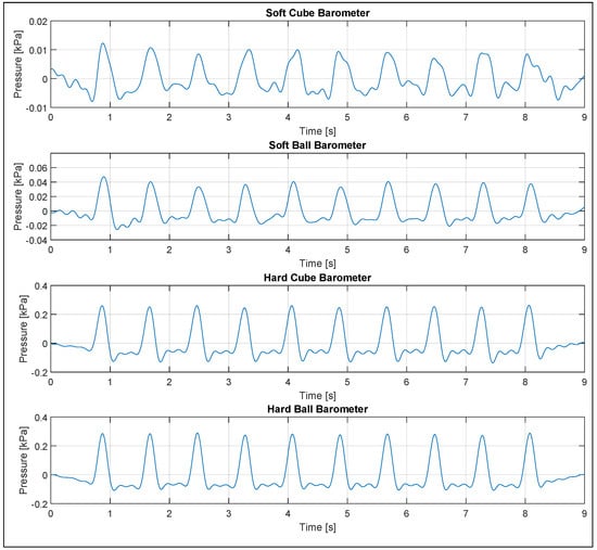 A drift in the baseline pressure reading of the barometer in the soft cube (Figure 8c) was observed. A drift of approximately ±20 Pa was present across all sensors either due to air leaking or getting trapped within the 3D-printed structure or the sensor core through the USB-C connector port. This drift was not of particular concern as the sensor could still consistently pick up on the dynamic changes in pressure caused by the actual squeezing of the toy. However, applying a 0.5 Hz high-pass filter helped filter out such a drift and the baseline offset of the ambient room pressure as well (Figure 9).