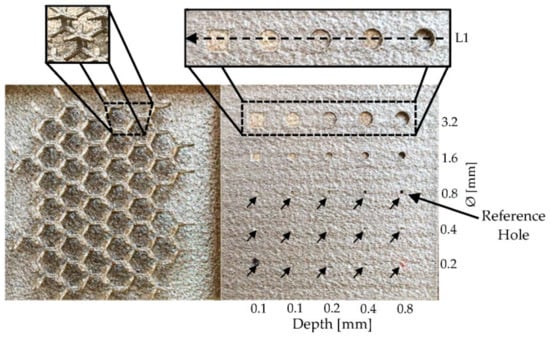 LPBF-produced part. Left side with a 3D hexagonal lattice and right side with a pattern with different diameters and depth holes (squared holes in the left-most column).