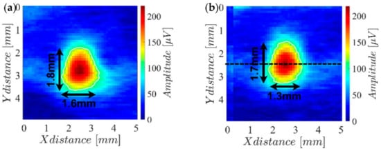 Amplitude imaging results measuring (a) coil 1 (22 µH) and (b) coil 2 (68 µH) while performing a two-dimensional scan over the reference hole of the LPBF-produced part.