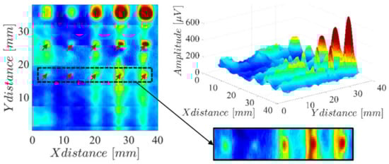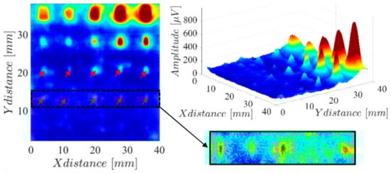 The obtained results are shown in Figure 16 and reveal the presence of all the hole defects whose diameter is greater or equal to 0.8 mm. The result in Figure 16 also highlights some mismatch in the sensitivity of each sensor channel, which can be observed in the horizontal lines every 5 mm.
