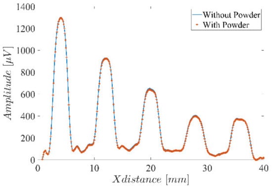 An additional test was performed to validate the negligible influence of the powder on the ECT results. A scan along the line L1 in Figure 1 was performed with and without the presence of the stainless steel 316 powder. Figure 4 clearly shows that the powder has an unnoticeable influence over the ECT results. Further results throughout the manuscript were obtained without the powder’s presence.