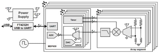 A total of 16 sensors were handled using dedicated signal conditioning and demodulation, and an MSP430 microcontroller was shared per each group of the four sensors, the architecture of which is shown in Figure 5. Besides the main readout electronics, the probe also includes power management, a shared oscillator, and a universal serial bus (USB) interface.