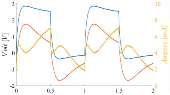 To avoid sine waveforms, Direct Digital Synthesis generation, together with linear amplification square waveforms generated using digital timers/counters, are proposed. A drawback of this is that the excitation harmonic content may limit the applied sensor preamplification. Yet, given the limited digital output slew rate and the polarization resistors, the excitation current harmonic content is partially reduced. Figure 7 shows the excitation square waveform together with the coil voltage and current.