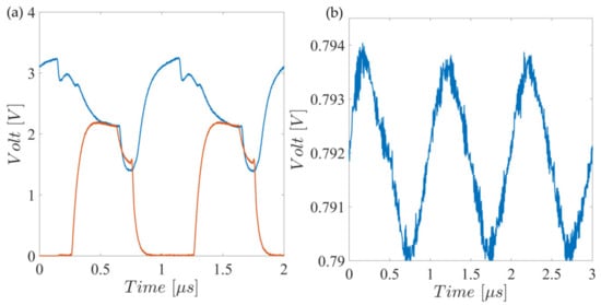 Characterization results are shown in Figure 11 where (a) shows the demodulator input (blue) and the transistor drain node voltage, where the binary multiplication result can be observed. Figure 11b shows the full demodulator output, which is forwarded to the MSP430 for further processing.