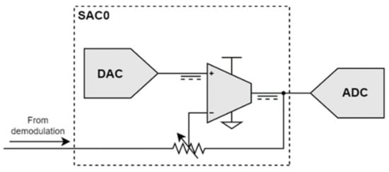 Before digital acquisition, offset removal and vector amplification are applied to the demodulated signal. These are implemented using the MSP430 Smart Analog Combo (SAC) peripherals. Each SAC incorporates a 12-bit Digital to Analog Converter (DAC) and a low-power Programmable Gain Amplifier (PGA) with a gain of up to ×33. Each SAC is programmed to operate in the inverting mode as shown in Figure 12.