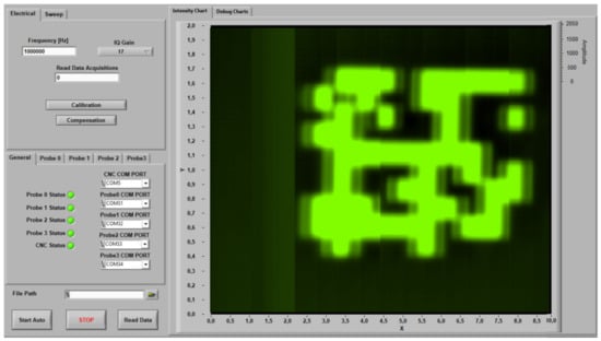 The developed GUI computer application front panel is presented in Figure 14, including controls to configure the operational parameters such as the excitation frequency and the vector amplification gain. There are also two dedicated buttons, “Calibration” and “Compensation”, used to trigger the demodulation phase-shift adjustment and the offset removal algorithms, respectively. Besides the control functionality, the GUI allows visualization and saves the results in MATLAB format.