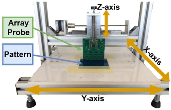 The array probe was attached to an available XY table to emulate the LPBF machinery recoater movement, Figure 15. This table includes two stepper motors to provide motion along the X and Y directions with resolutions down to 50 µm. The vertical along Z probe position is adjusted manually.