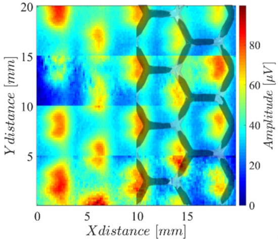 Amplitude imaging result measuring the array probe on a two-dimensional scan over the 3D hexagonal lattice surface of the LPBF-produced part.