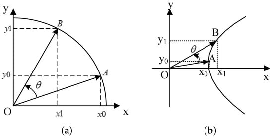 The basic idea of CORDIC is to decompose the trigonometric operation into a set of linear combinations of micro-rotation angles, as shown in Figure 2. A two-dimensional vector  is rotated by an angle  to calculate the rotated vector  under the two rotation models. This transformation can be expressed, respectively, as []