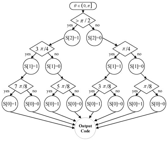 The angle mapping module aims to map the input target phase  to a smaller angle range. It yields a significant advantage of computational complexity when narrowing the angle range. In this paper, we divided the input angle into 16 equal domains with the uniform span of . Let us take the first and second quadrants as an example: angle mapping can be realized through binary coding based on the domain folding, as shown in Figure 3.