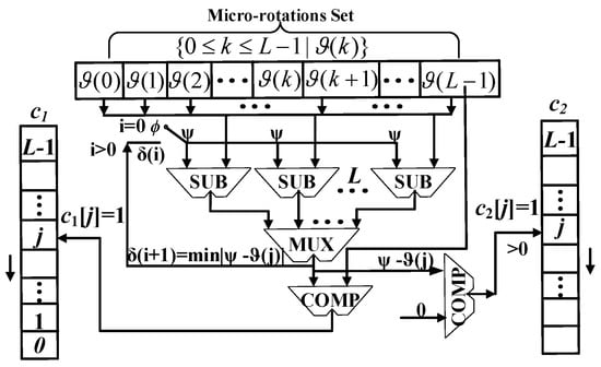The original input angle phase can be mapped to  by the angle mapping, then we can reduce the iteration number by reducing the redundant computation of unnecessary micro-rotation angles in the iteration process. The greedy-based angle recording module is shown in Figure 4. Based on the set of micro-rotation angles , we used L subtractors and one multiplexer to express the mapped angle  with several micro-rotation angles and L-bit codes , where  are used to compute the scaling factor, the direction of the sign function, and the shift value in the iteration unit. This process adopts a parallel pipeline structure to ensure  are generated within one clock cycle. Since the magnitude of the sign function is 1 and the sequence  is decreasing, the convergence of this process can be proven.
