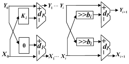 By factoring  and the approximation equation , the calculation can be simplified by several shifts and add operations. Then, we can obtain the direction of sign function  and shift value  by determining the value of each bit within  in the ith iteration process. Figure 5 shows one stage of the iterative structure, and it can be described as