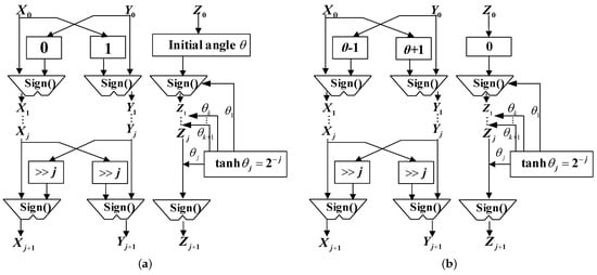 For the hyperbolic CORDIC, it should be noted that, when the iterative sequence number equals , the corresponding stage of iterations should be executed again to ensure the algorithm converges []. The iterative recursive equation can be derived as