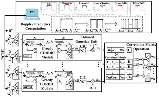 The temporal autocorrelation and spatial cross-correlation of multiple channels are very important, especially for the antenna arrangement, placement, and evaluation of MIMO systems []. To control the correlation of different channels or paths, we developed a correlated multiple Gaussian sequence generation scheme, as shown in Figure 7. It consists of three parts, i.e., the Doppler frequency computation, a time-division (TD)-based Gaussian unit, and the correlation matrix operation.