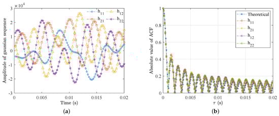 After implementing the method of Figure 7 on an FPGA chip, we exported the output fading data using the Xilinx Chipscope tool and analyzed them using the MATLAB software. The sampling rate and period were 100 MHz and 20 ms, respectively, e.g.,  samples. Figure 8 depicts the amplitude of the four Gaussian sequences and the corresponding ACF. As we can see, the generated ACFs provided a quite good approximation to the theoretical ones, which can be expressed by the zero-order Bessel functions []. The average deviation of the ACFs between the theoretical and generated ones was about 1.26%, which can meet the wireless channel digital twin requirement.
