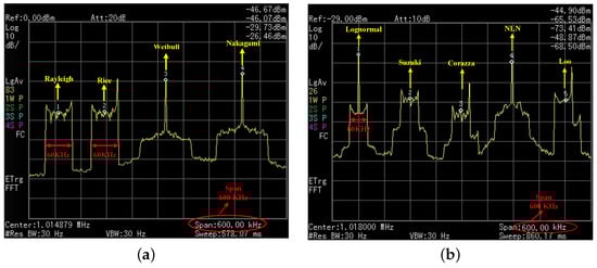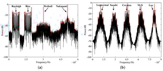 To validate and evaluate the proposed CORDIC-based fading generation method, we implemented the proposed arbitrary channel fading generator on a Xilinx FPGA (XC7K325TFF G900) hardware platform, where the channel consisted all the fading types in Figure 1. The system clock was 100 MHz, and the output fading data width was 16-bit. Firstly, the theoretical simulation and hardware measurement results of the DPSD of different types of channel fading were carried out as shown in Figure 9 and Figure 10. The small-scale channel fading of Rayleigh, Rice, Weibull, and Nakagami, the large-scale channel fading, and their derived fading groups, lognormal, Suzuki, Corazza, NLN, and Loo, were observed. The output of the channel emulator was divided into two groups to set four and five diameters, respectively, among which the Doppler spread of each multipath was set at 60 KHz. The measured spectrum shapes were consistent with those of the theoretical ones, which verified the correctness of the developed channel fading generator [].