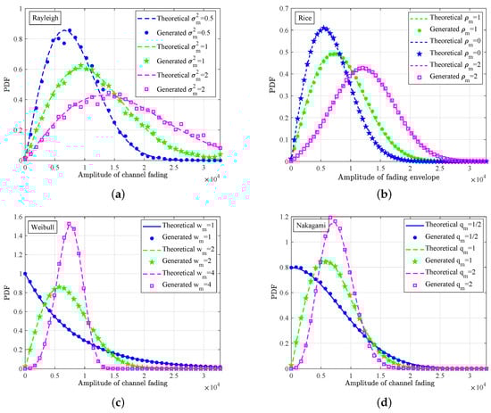 PDFs of (a) Rayleigh, (b) Rice, (c) Weibull, and (d) Nakagami fading envelope.