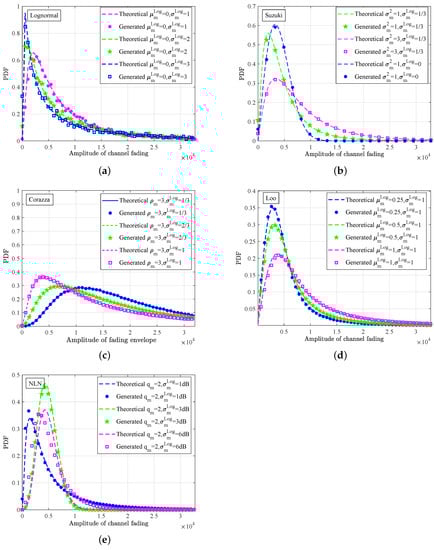 PDFs of (a) lognormal, (b) Suzuki, (c) Corazza, (d) Loo, and (e) NLN fading envelope.