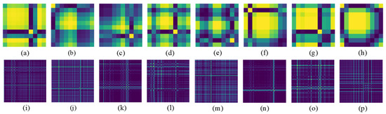 Demonstration of sEMG-GAF images of different gestures from NinaPro DB1 dataset (a–h) and CapgMyo DB-a dataset (i–p) on the specified moment. The gestures include thumb up as shown in (a) and (i), extension of index and middle, flexion of the others as shown in (b) and (j), flexion of ring and little finger, extension of the others as shown in (c) and (k), thumb opposing base of little finger as shown in (d) and (l), abduction of all fingers as shown in (e) and (m), fingers flexed together in a fist as shown in (f) and (n), pointing index as shown in (g) and (o), and adduction of extended fingers as shown in (h) and (p). The different colors in sEMG-GAF images indicate relationships between the instant values in different sensors. The color difference between the images of different gestures indicates the degree of differentiation of gestures.