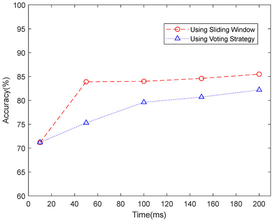 Recognition accuracy comparison between using sliding window and voting strategy in NinaPro DB1.