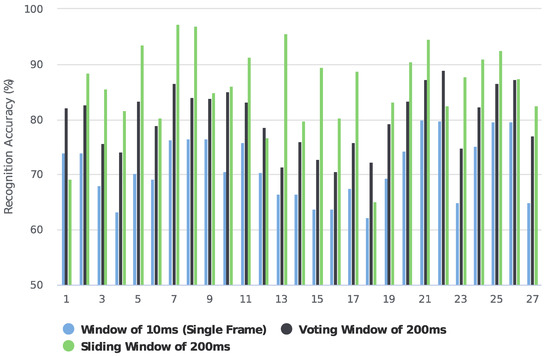 Recognition performances of 27 subjects when using single frame of 10 ms, voting time window of 200 ms, and sliding time window of 200 ms in NinaPro DB1.