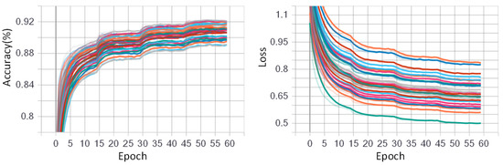 Training progress of fine-tuned GAF-CNN model for low-density dataset NinaPro DB1. The epoch number was set to 60 and different colors denote the 27 different subjects. The different color lines indicate different subjects.