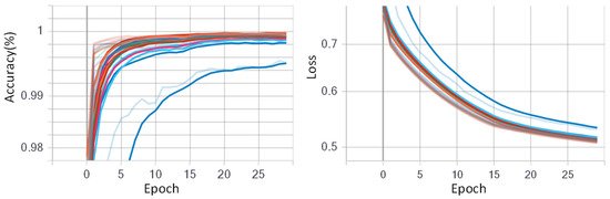 The CNN model was initialized with randomized weights and trained using stochastic gradient descent (SGD) with a data batch size of 512 for all experiments. For fine-tuning the CNN model, the initial learning rate was assigned as 0.05 with a decay rate of 0.5. The initial learning rate was chosen large enough to accelerate the learning process in the beginning. The epoch number was set to 60 for dataset NinaPro DB1, and 30 for other datasets. Figure 9 and Figure 10 show the training progress of the fine-tuned CNN model for the low-density dataset NinaPro DB1 and the high-density dataset CapgMyo DB-a, respectively. The left shows the deviation i the accuracies on different training epochs, and the right shows the loss deviations in different training epochs. It is worth mentioning that 70% data were used for fine-tuning the AlexNet model, and the remaining 30% was used for testing the fine-tuned CNN model.