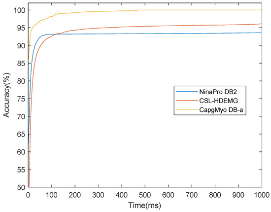 Based on the instantaneous classification results, the recognition accuracies could be improved with a majority voting strategy. Figure 11 shows the recognition accuracies over different voting windows on high-density datasets of NinaPro DB2, CSL-HDEMG, and CapgMyo DB-a. It is clear that the recognition accuracies grew when larger voting windows were applied. For example, a classification accuracy of 93.3% was achieved on an instantaneous sEMG image on CapgMyo Db-a, and 99.5%, 99.7%, and 99.8% by majority voting over 40 ms, 150 ms, and 300 ms, respectively.