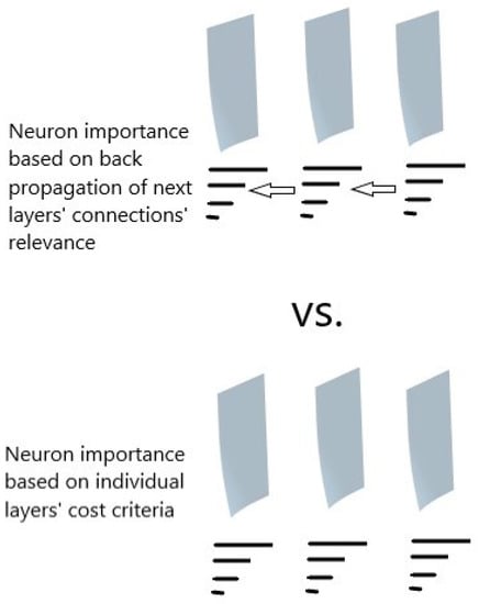The majority of the previous works had paid attention to the individual pruning of layers while not considering the connection between different layers. In [13], they claimed that the last FC layer is the most relevant of the entire network regarding the effect on the final response of the entire network. Considering this last, they proposed to prune the previous layer of the network when considering the connections of neurons with the neurons of this last FC layer called the Final Response Layer (FRL). In this way, the relevances of the neurons considered independently for the FRL were backpropagated to the previous layer’s neurons. The pruning of the rest of the layers was carried out similarly, scoring the relevance of the neurons when considering the connections with the posterior layers’ neurons.