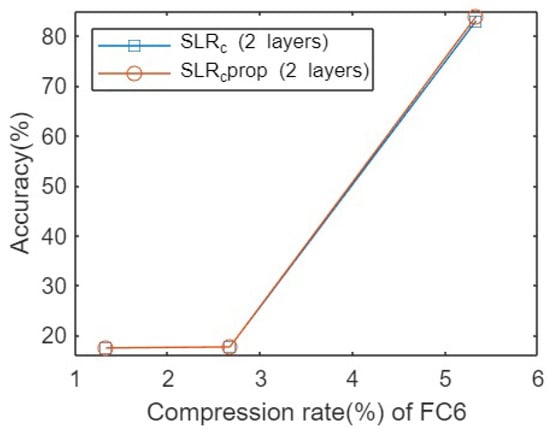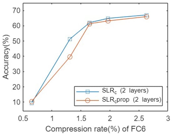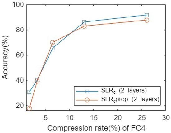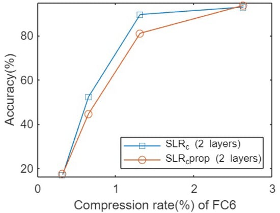 Finally, both methodologies for pruning FC layers were adopted for pruning FRL and the previous FC layer of the Room Occupancy Detection dataset. Figure 5 shows the accuracies obtained for different compression rates. There is a clear tendency towards SLRProp in terms of accuracy, which determines that for the majority of the regions of compression SLRProp outperforms the SLR method.