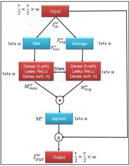 where T is successive identical blocks, denotes the multichannel channel attention function and denotes the spatial attention function. Keep in mind that each block’s output has the same dimension as its input.
