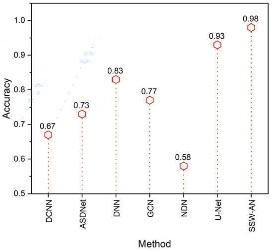 Accuracy of various methods. Current SSW-AN is compared with DCNN [37], ASDNet [38], DNN [35], GCN [39], NDN [40] and U-Net [41].