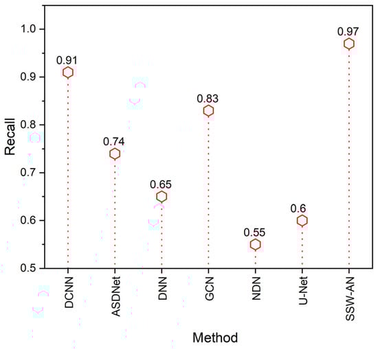 Recall of various methods. Current SSW-AN is compared with DCNN [37], ASDNet [38], DNN [35], GCN [39], NDN [40] and U-Net [41].