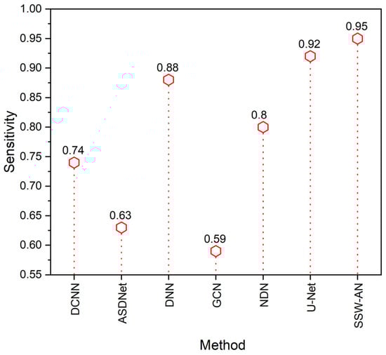 Sensitivity of various methods. Current SSW-AN is compared with DCNN [37], ASDNet [38], DNN [35], GCN [39], NDN [40] and U-Net [41].